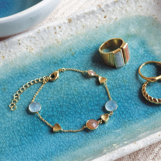 Tahiti Sunset Gemstone Charm Bracelet 18ct Gold Plated, Aquamarine, Peach Moonstone