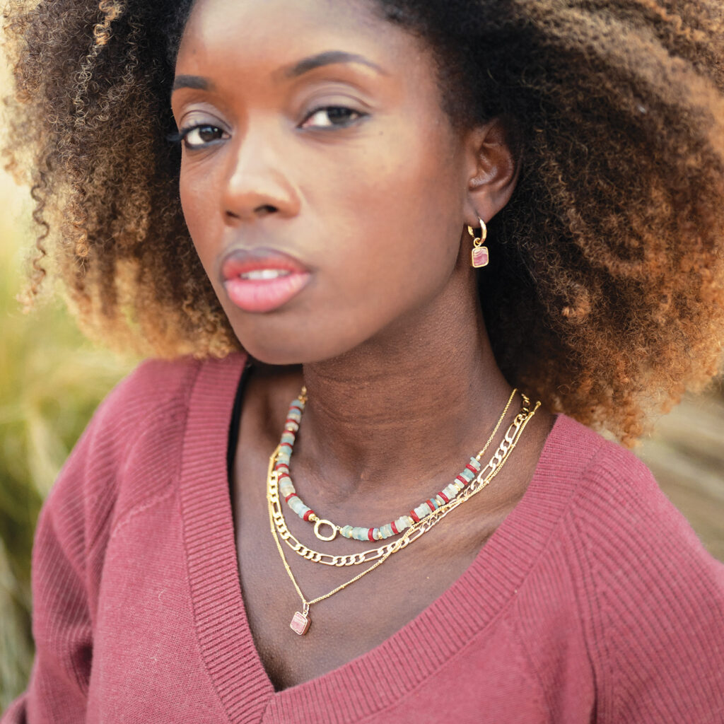 Get ready for jewellery envy. This chic design is the ultimate everyday necklace to wear solo or layer your way. Set with hand cut Rhodochrosite on a dainty bobble chain this piece brings extra sparkle and a splash of colour to your style. Pair with matching Aztec Earrings. Perfect for gifting. Gemstone colour and opaqueness will vary due to the unique nature of semi precious stone variation as each cut gem is individual.