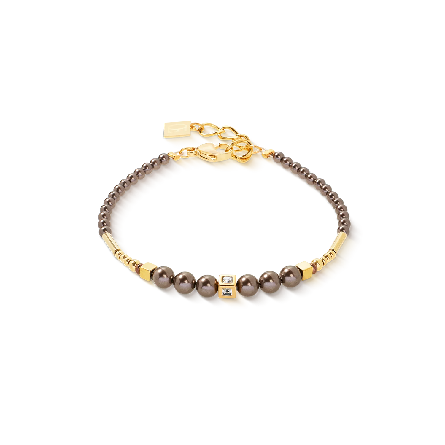 The Shimmering Princess Pearls gold-brown bracelet combines the elegant radiance of Swarovski® Crystal Pearls with the powerful reflections of hematite with a titanium oxide finish. A gold-plated stainless steel cube with crystal forms the radiant centrepiece of the design and provides elegant accents. The high-quality workmanship makes the bracelet durable and comfortable to wear - a stylish companion for every day.