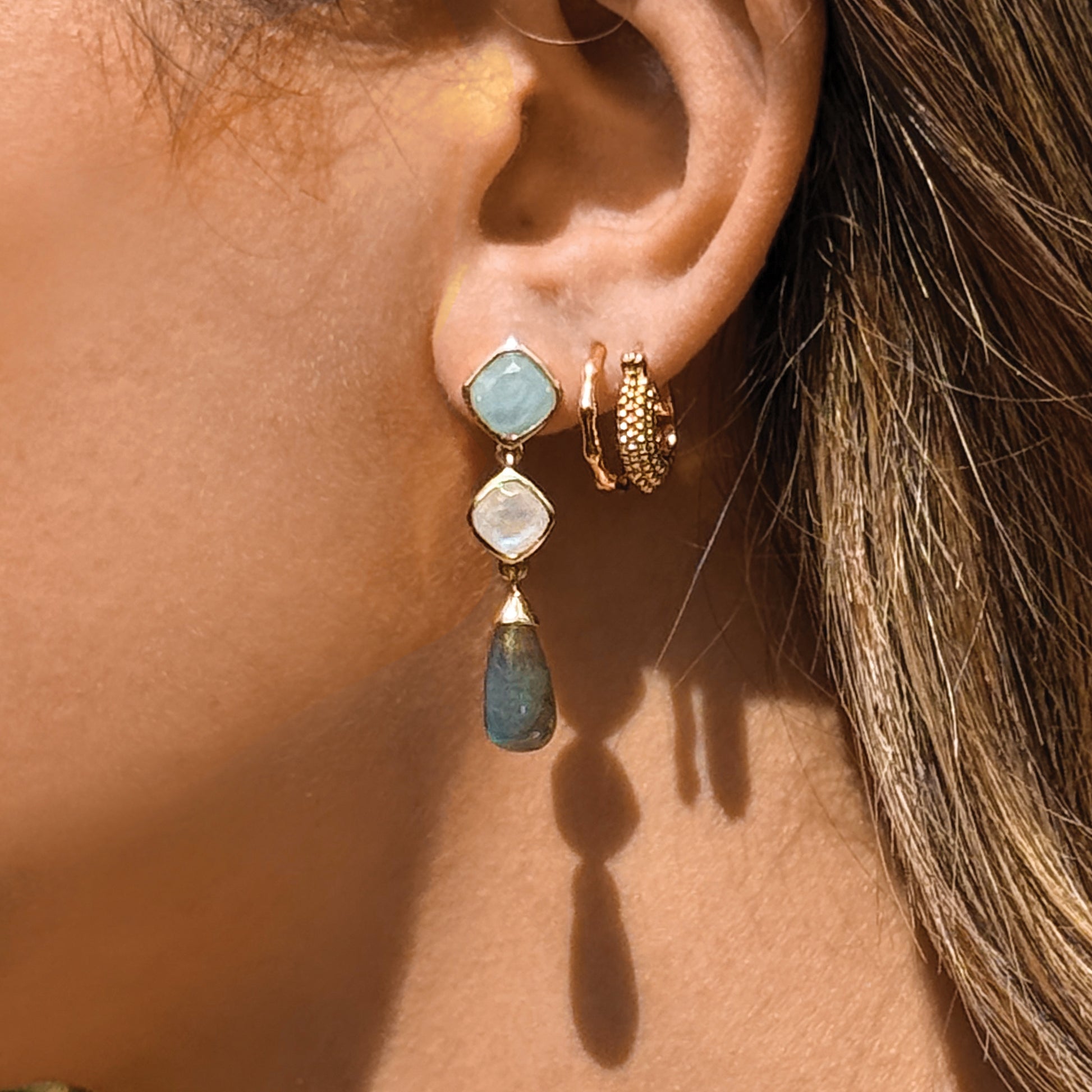 Luxury earrings to be worn solo, or make a statement by layering with your favourite huggies. A unique design of Aquamarine, Rainbow Moonstone and Labradorite in a kaleidoscope of cool, coastal tones, destined to become your new go to piece. Perfect for upscale gifting. Gemstone colour and opaqueness will vary due to the unique nature of semi precious stone variation as each cut gem is individual.