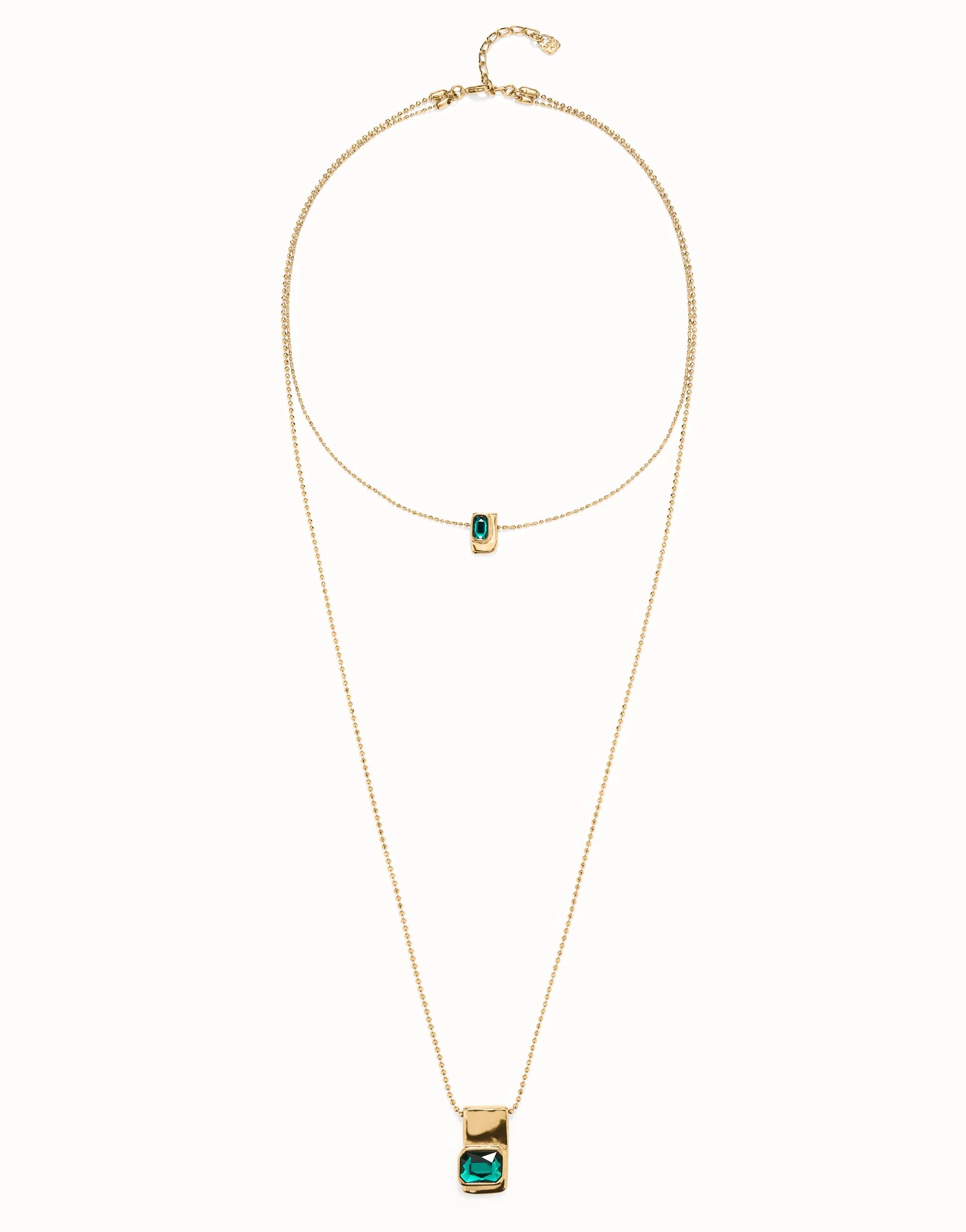 Double 18K gold-plated chain with two different lengths and faceted green crystals. Made in Spain with a 100% handmade process. These pieces of jewelry are an art exhibition composed of bracelets, rings, necklaces and earrings, where each piece is a work of art in which we find emerald style cut crystals and pieces with layers of geometric shapes.
