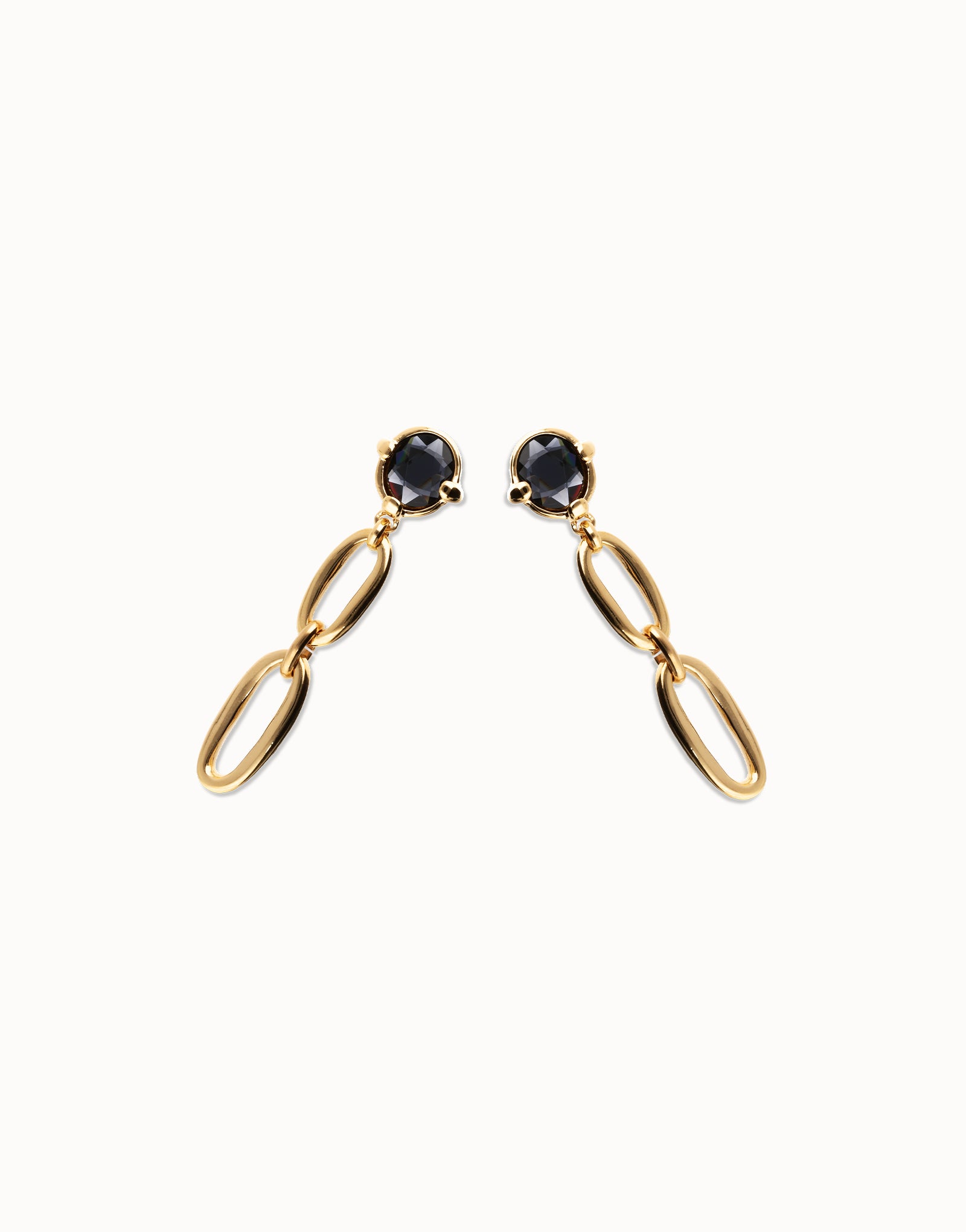 This designer piece fuses warm opulence with the sophistication of black crystal at the top and the visual strength of robust links that make up its drop.