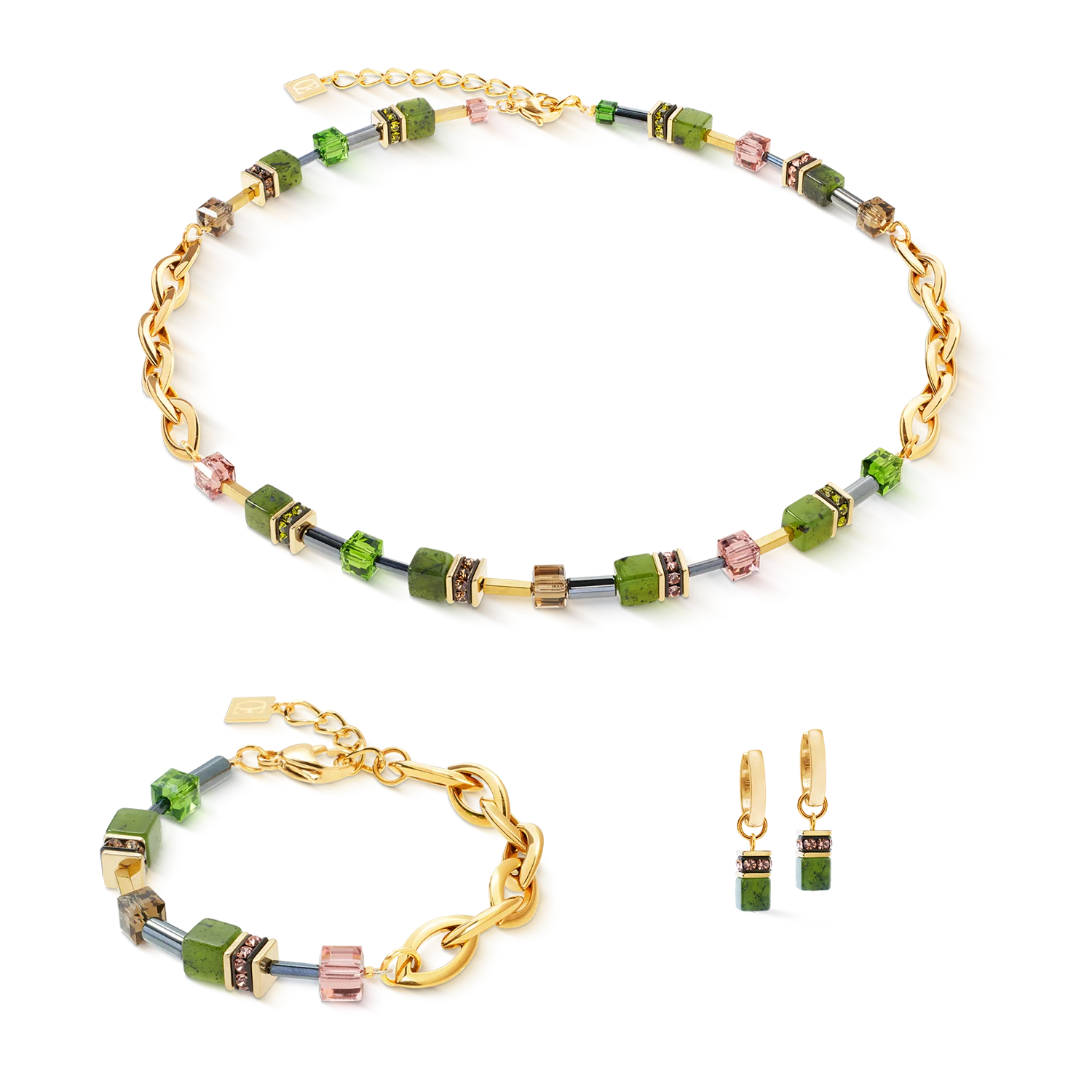 Fresh elegance with an iconic touch The GeoCUBE® Chunky Chain necklace gold-green combines the striking chain links made of gold-plated stainless steel with the clear shape of the iconic GeoCUBE® elements. The centrepiece is nephrite in vibrant green, a gemstone that has always been valued for harmony and balance. It is complemented by faceted Swarovski® crystal cubes and sparkling crystals that lend the design luminosity and modernity. This extraordinary composition of natural strength and urban chic makes the necklace a statement of self-confident style.
