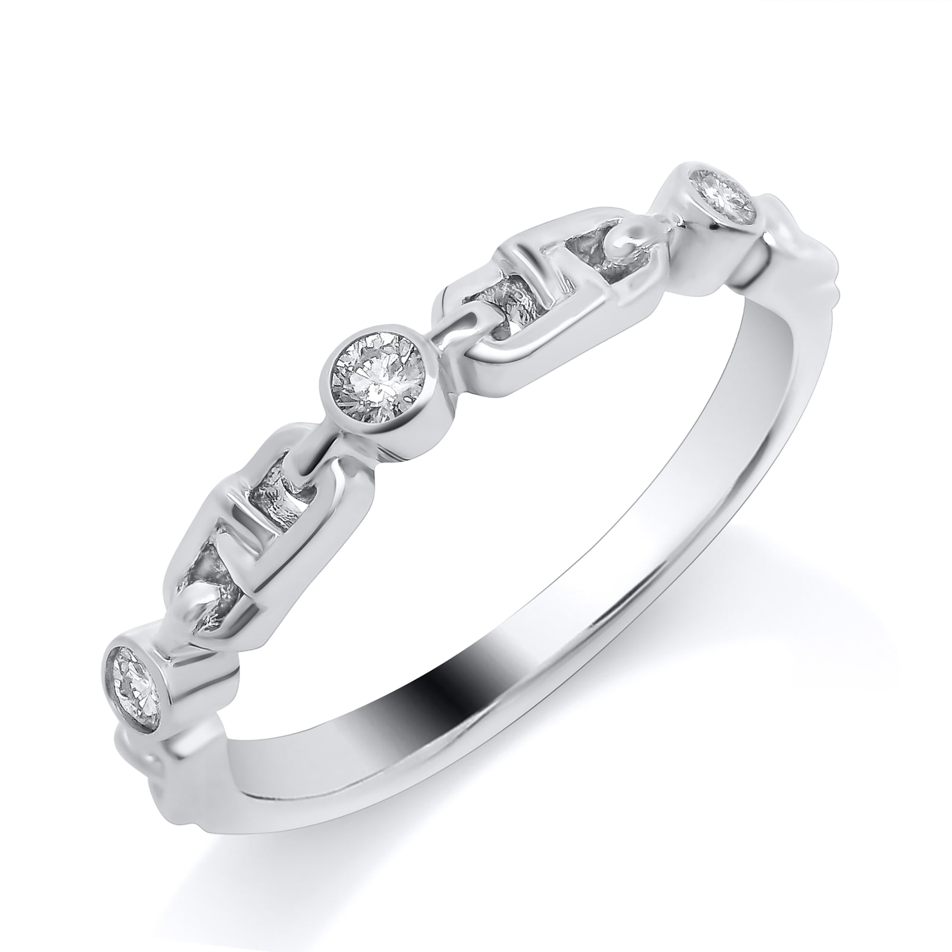 Three brilliant cut diamonds in bezel settings, complemented with a chain detail.