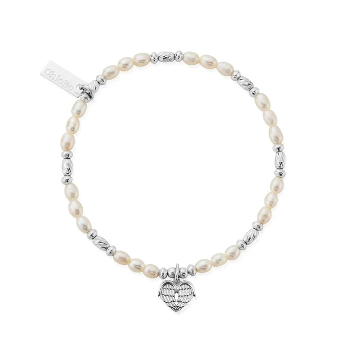 The Heart Of Love bracelet features an angel wing heart charm, worn as a symbol of love, comfort, guidance and protection. A reminder of someone we hold dear to our hearts. The charm is set amongst 925 sterling silver beads and freshwater pearls for a subtle sparkle.