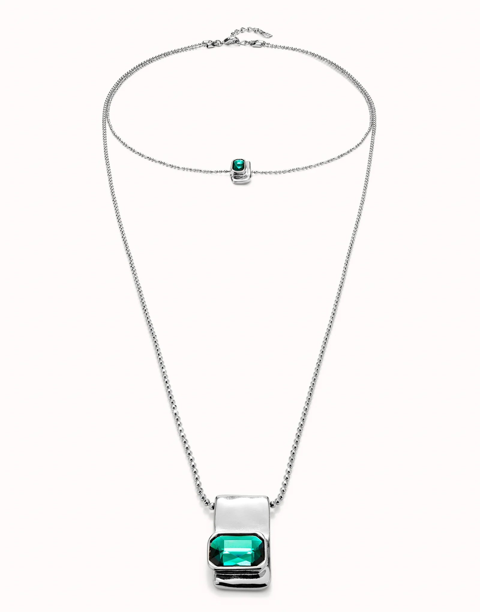 Double sterling silver-plated chain with two different lengths and faceted green crystals. Made in Spain with a 100% handmade process. These pieces of jewelry are an art exhibition composed of bracelets, rings, necklaces and earrings, where each piece is a work of art in which we find emerald style cut crystals and pieces with layers of geometric shapes.