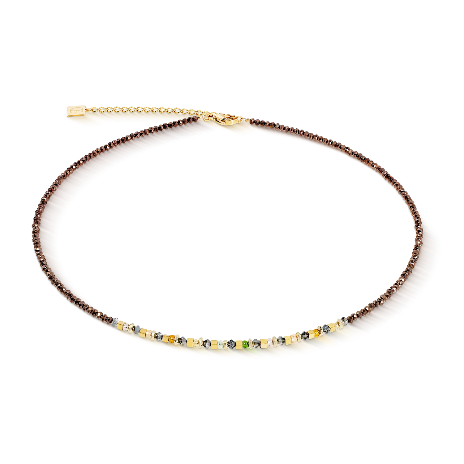 The Golden Whisper brown-olive necklace plays with filigree arrangement and modern lightness. A frame of sparkling brown crystals leads elegantly to a middle section that is characterised by fine Swarovski® crystals, delicate glass beads in soft colours and gold-coloured accents. This combination gives the necklace an airy, youthful flair and makes it a versatile accessory. The interplay of warm and light-coloured nuances creates a lively sparkle that is perfect for everyday and evening wear. A necklace that combines delicacy and expressiveness in a unique way.