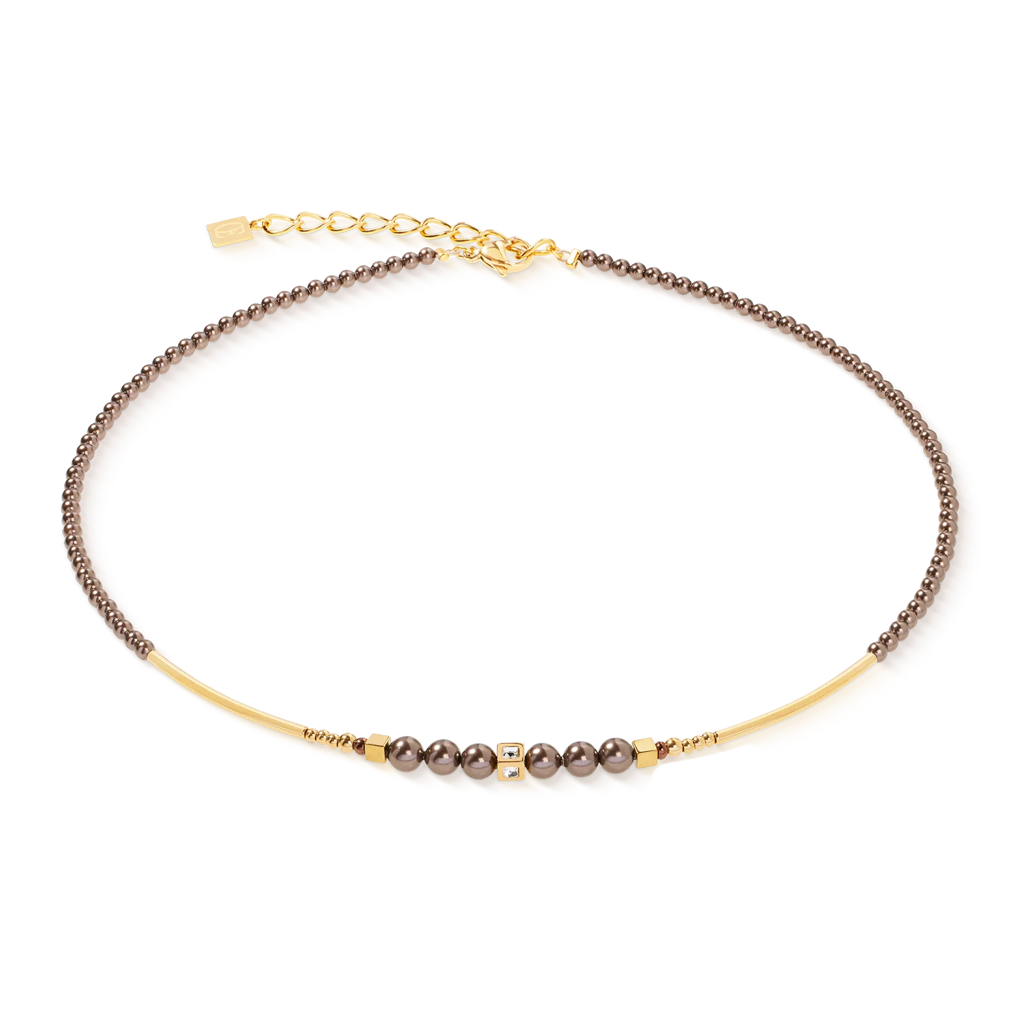 The Shimmering Princess Pearls gold-brown necklace combines precious Crystal Pearls by Swarovski® with hematite beads with a titanium oxide finish and a gold-plated stainless steel cube with a sparkling crystal in the centre. The interplay of warm gold tones and shimmering brown nuances lends it a modern elegance that impresses both in everyday life and on special occasions. Handmade in Germany, the necklace stands for the highest quality and timeless design.