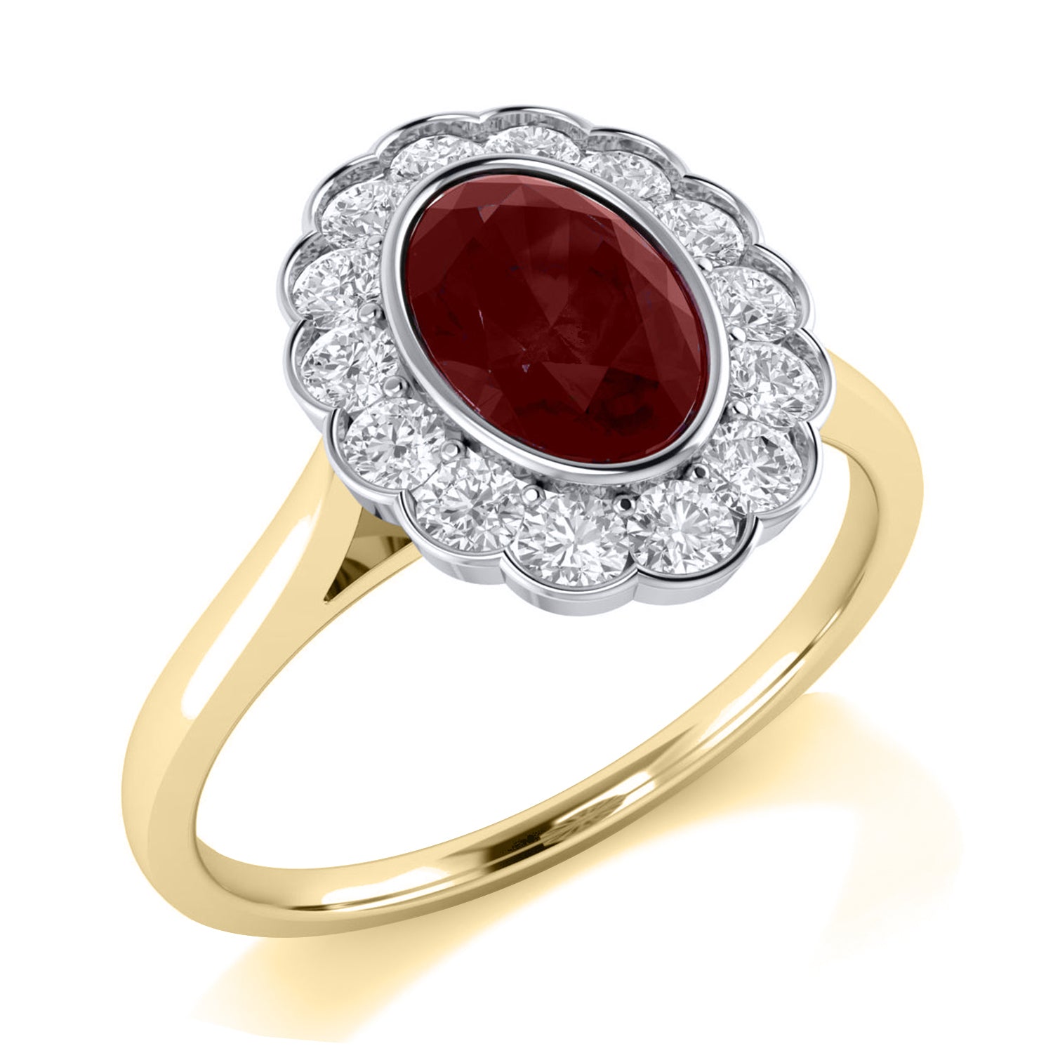 Oval cut colour stone in a bezel setting with a diamond halo.