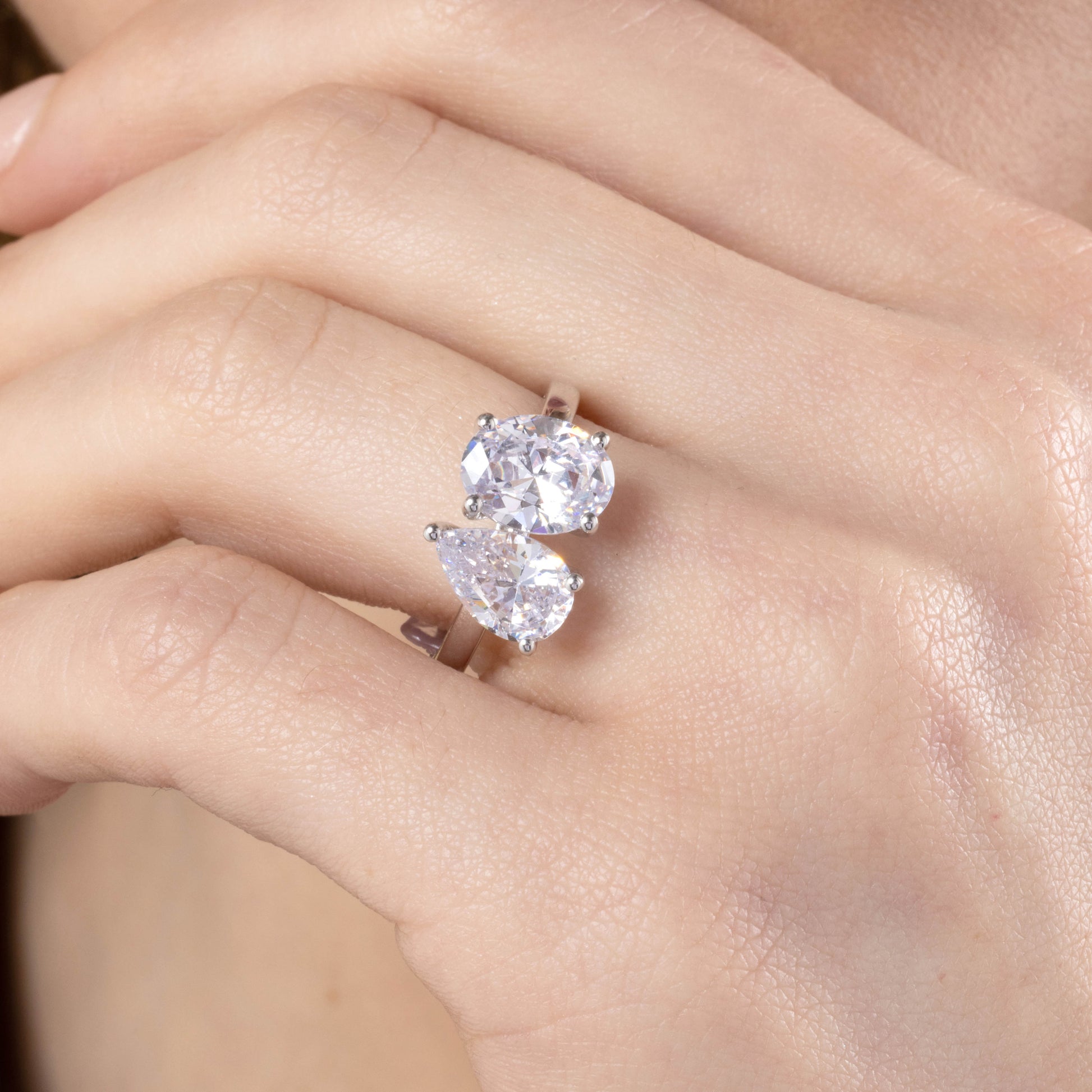 'Toi et Moi' ring, featuring a stunning combination of pear and oval cut diamonds in a claw setting. Available in Platinum or Gold. Certified 2.50 Carats Lab Grown Diamonds Colour D, VS.