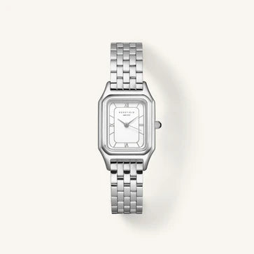 Rosefield's Ivy collection distils watchmaking to its essentials: a pristine white matte dial paired with a commanding double silver frame that defines the case. The layered bezel construction creates dimensional sophistication, whilst the silver bracelet and case ensure seamless coordination across your wardrobe. Precision movement and durable construction underpin the design, delivering reliable performance alongside aesthetic restraint.