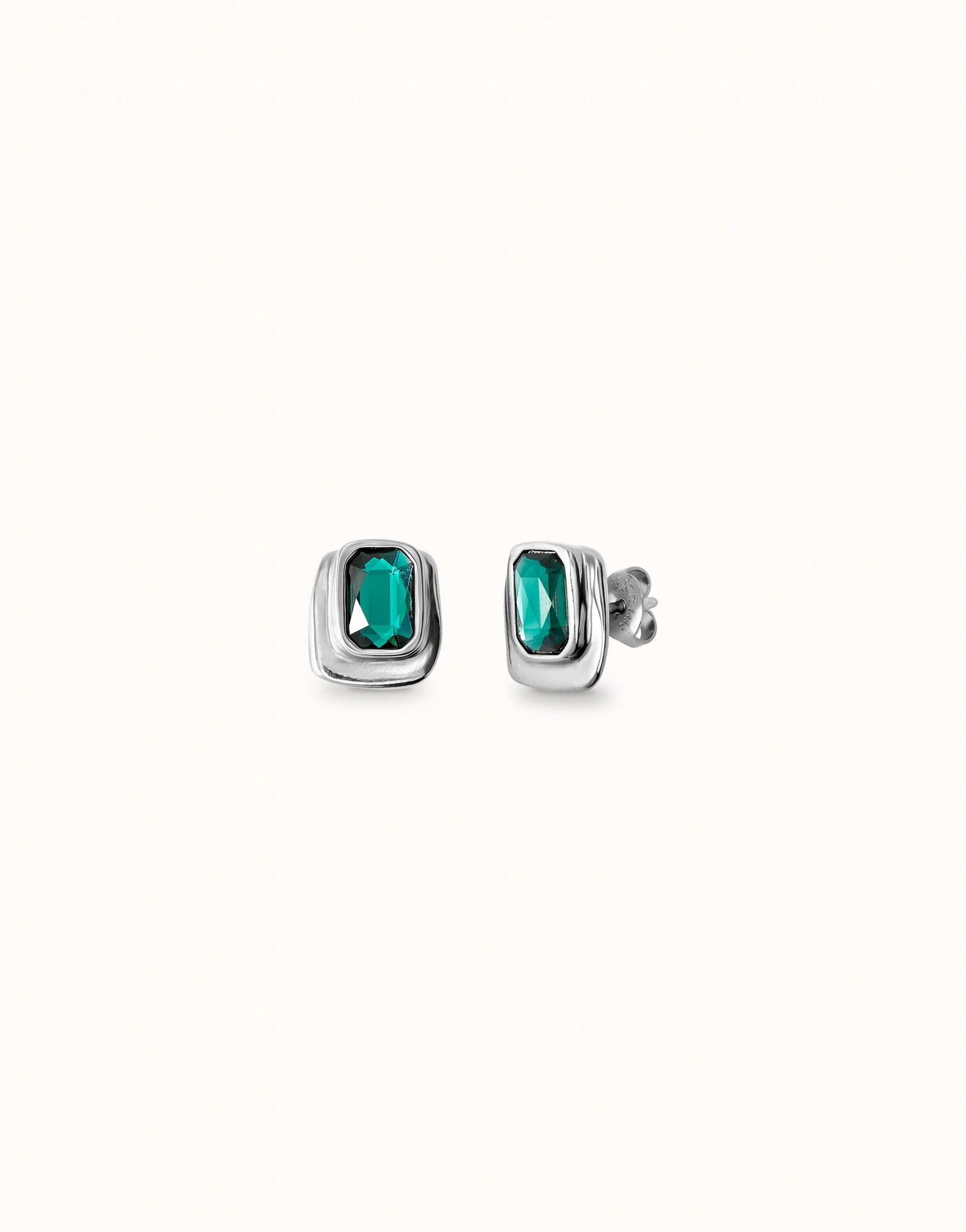 Rectangular sterling silver-plated earrings with faceted green crystal. Made in Spain with a 100% handmade process. These pieces of jewelry are an art exhibition composed of bracelets, rings, necklaces and earrings, where each piece is a work of art in which we find emerald style cut crystals and pieces with layers of geometric shapes. Discover the collection ser magnética.