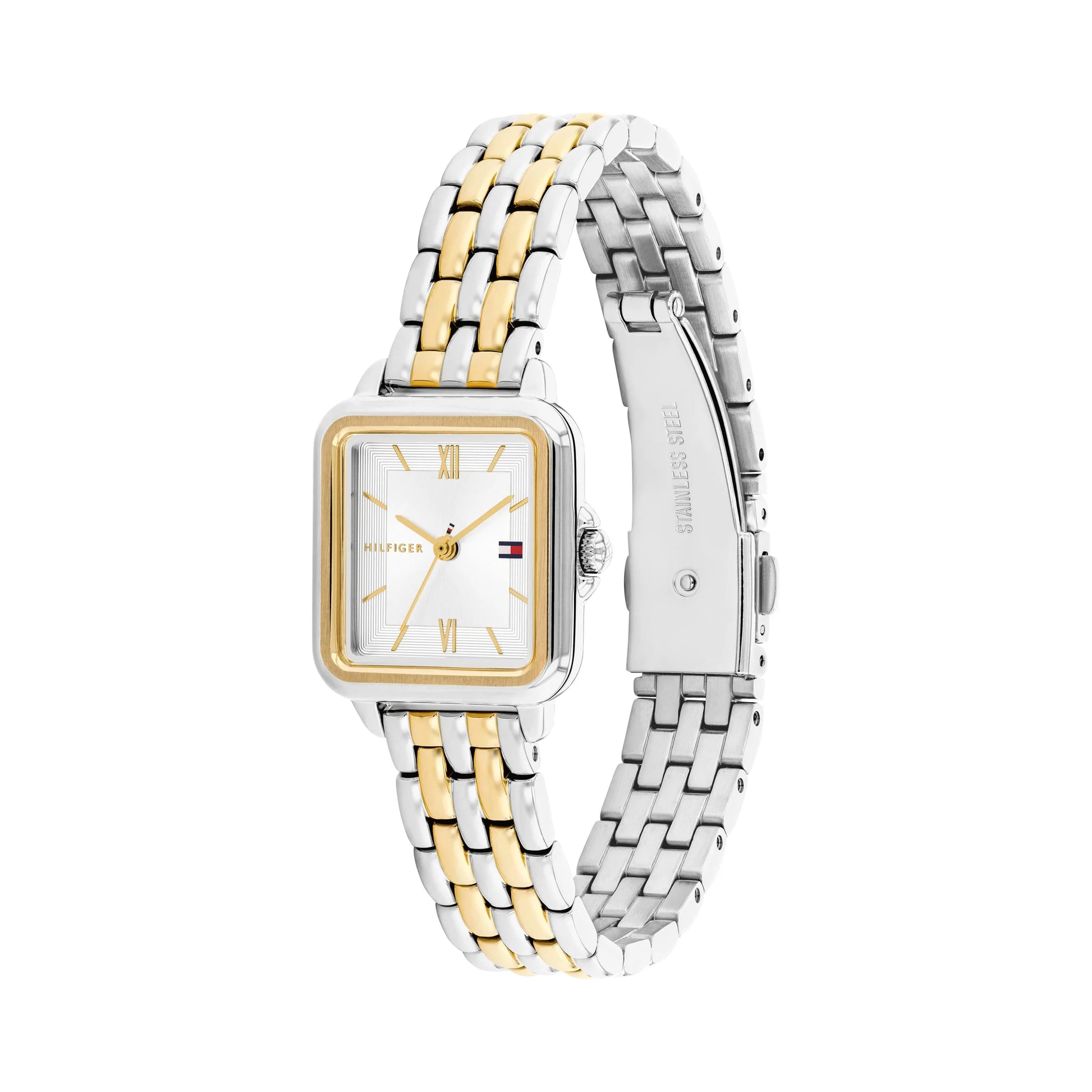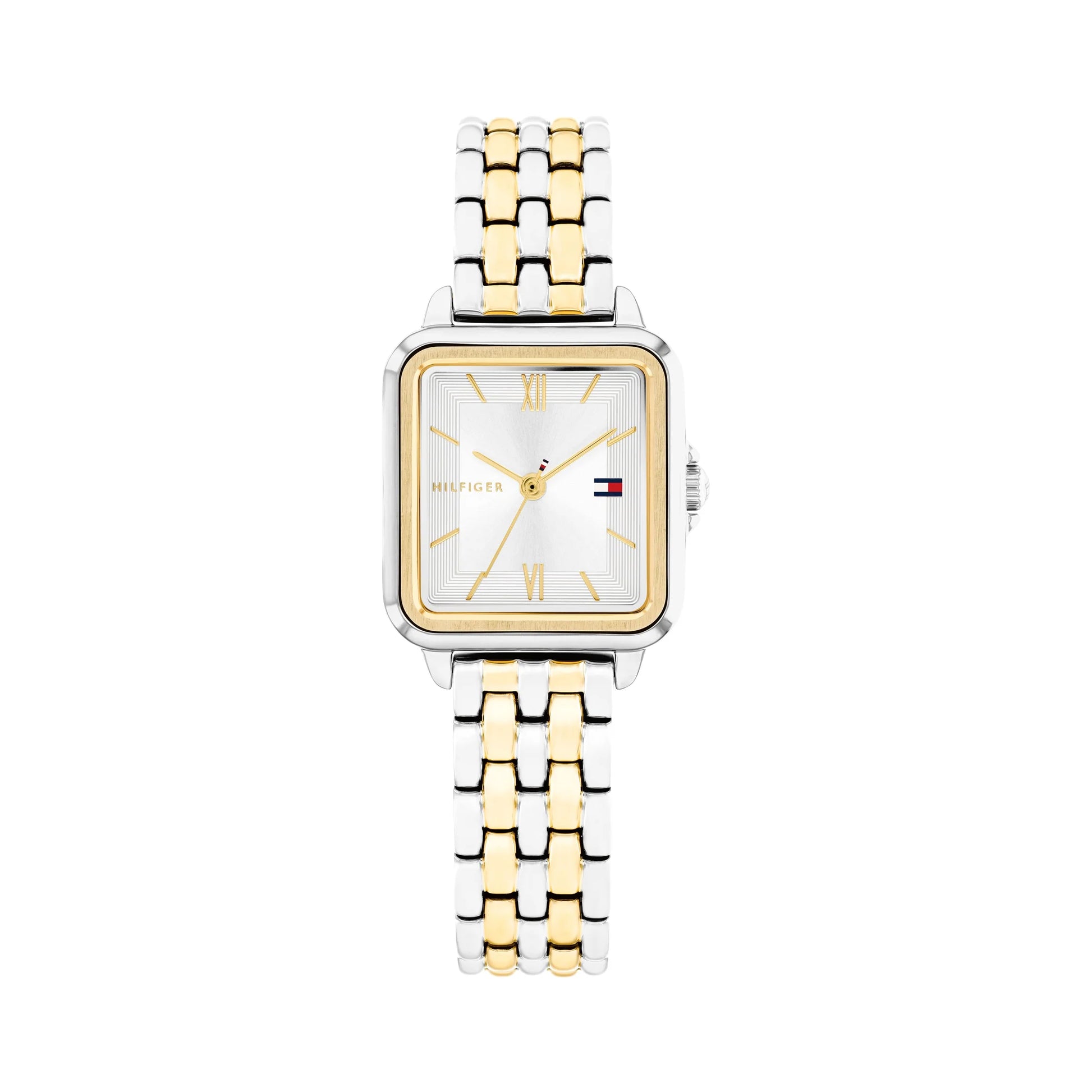 Tommy Hilfiger's Mia collection delivers understated elegance with this ladies' watch, featuring a rectangular silver dial accented by gold-tone indices and Roman numerals. Gold-tone hands provide precise timekeeping across the 22.5mm stainless steel case, whilst the two-tone bracelet with secure folding clasp adds refined contrast. Powered by reliable quartz movement and splash-resistant construction, this timepiece transitions effortlessly from professional settings to casual occasions, making it an essential addition to any jewellery collection.
